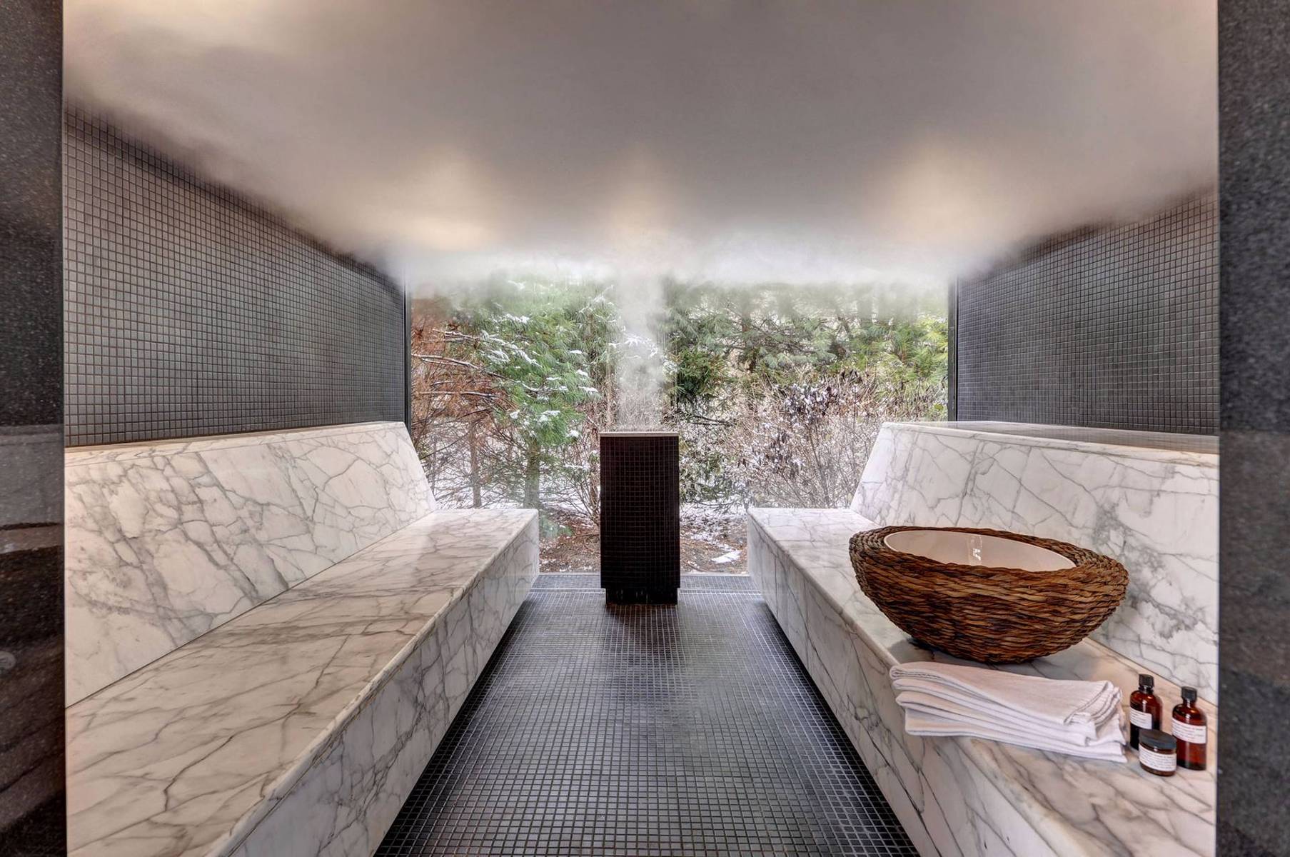 The scope included coordination of architectural, structural, mechanical, electrical, and specialty spa consultants to deliver a cohesive design that balanced aesthetics, performance, and code compliance. The separate spa building was constructed to include a full kitchen, great room with fireplace, sauna, caldarium, and warm tepidarium, requiring specialized environmental controls, moisture management systems, and high-performance finishes.